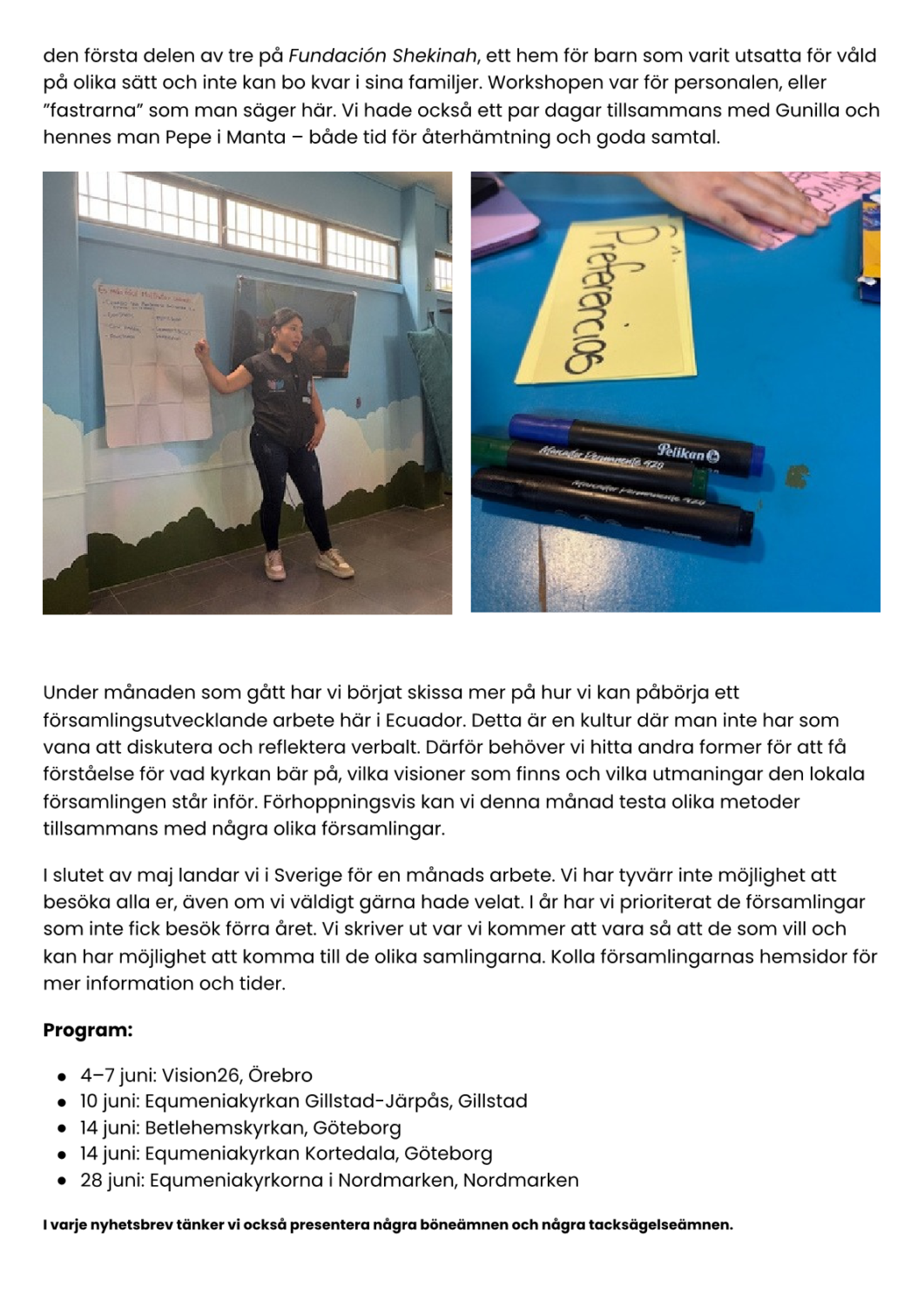 - Skriva samarbetsavtal med Evangeliska Förbundskyrkan i Ecuador