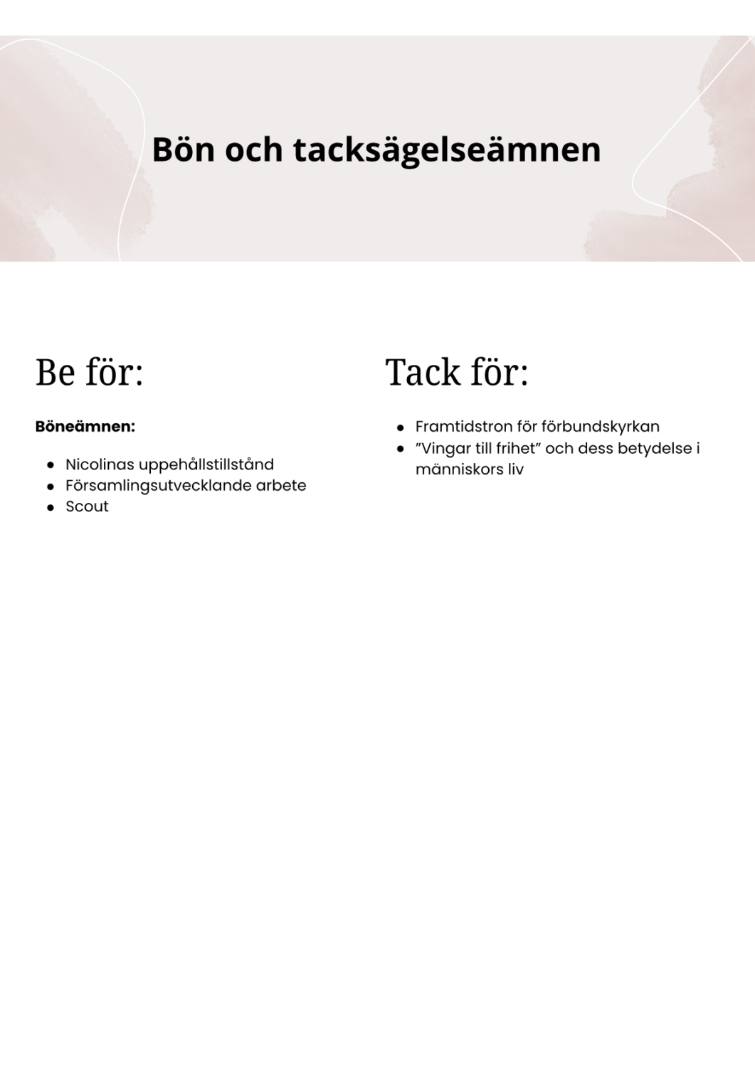 - Be. Vi ber gemensamt i gudstjänster och uppmuntrar alla att be för familjen.